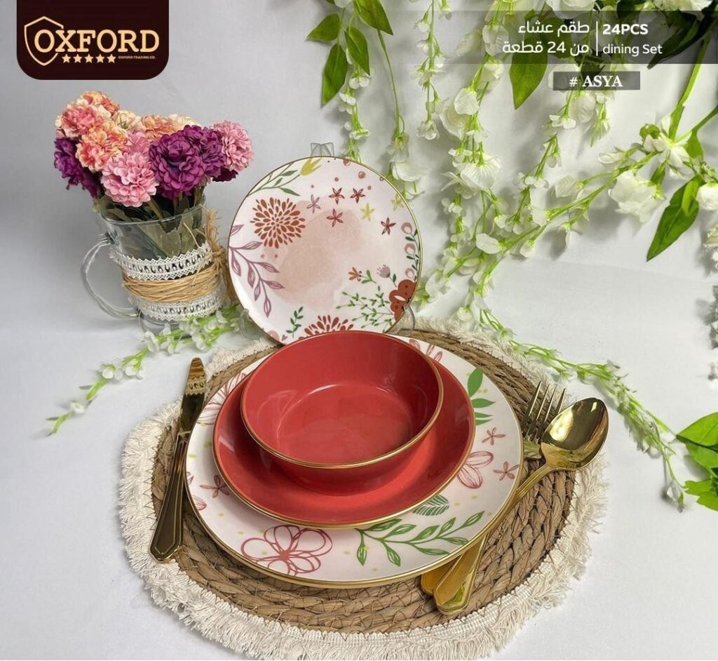 طقم عشاء – العدد : 25 قطعة – اللون :أبيض * موف – النوع : الحجري الحراري – مصنوع من أفخر أنواع البورسلين الحراري، متين ويتحمل الحرارة العالية بدون تشقق أو تشوه – أقوى من السيراميك، بملمس راقي وعزل حرارى مميزآمن تمامًا، يناسب الميكروويف، الفرن، الفريزر وغسالة الأطباق